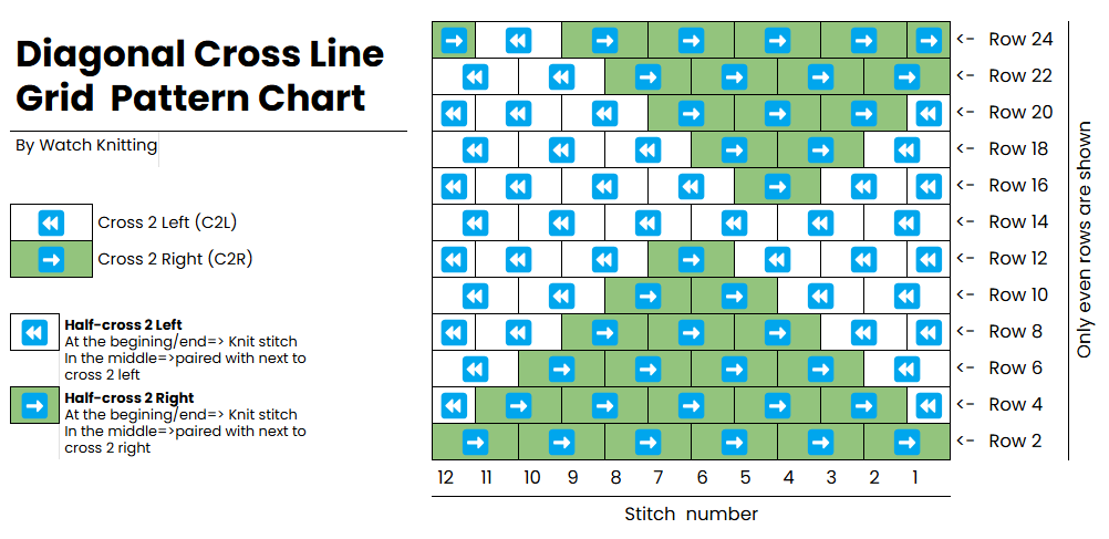 Today we’re diving into the magical rhombus stitch, also known as the diagonal cross line grid pattern! It’s worked over a multiple of 12 + 2 stitches and follows a 24-row repeat—half of which are simple purl return rows.