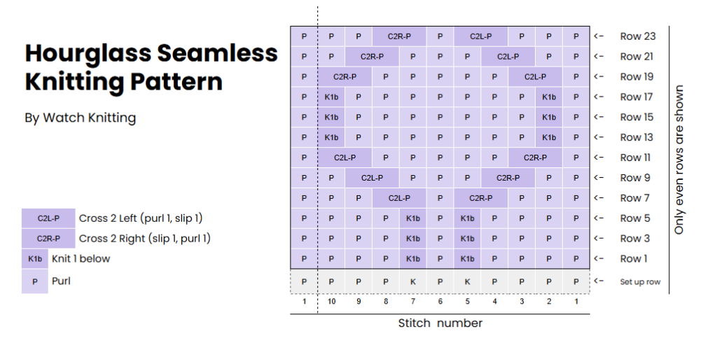 Looking for a stitch pattern that blends smooth structure with beautiful texture? Meet the Hourglass Seamless Pattern—a rhythmic design that uses twisted stitches and knit-one-below techniques to create elegant, flowing columns and offset waves.